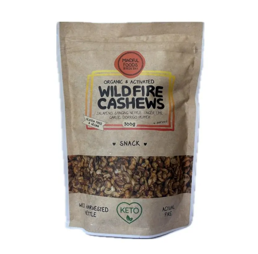 These aren't your average cashews. Mindful Foods Wildfire Cashews are lovingly activated (soaked and dehydrated) to enhance digestibility and crunch, then tossed in a smoky blend of herbs, spices, and Ziggy's Wild Foods Stinging Nettle Hot Sauce. With a rich umami hit and a hint of chilli warmth, they’re an irresistible pantry essential — perfect for snacking or sharing.