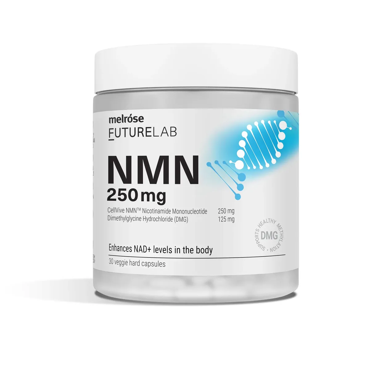 Melrose FutureLab NMN 250 mg contains Dimethylglycine Hydrochloride (DMG), a methyl donor that supports normal methylation processes in the body.