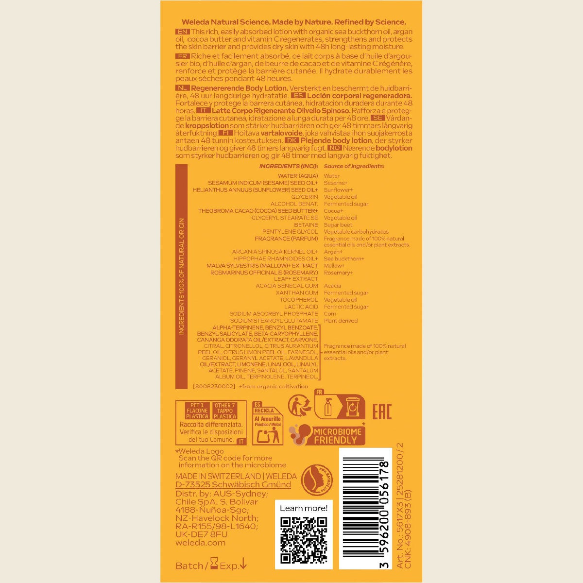 Regenerating Body Lotion soothes and protects the skin, and strengthens the skin barrier with organic Sea Buckthorn oil and Vitamin C.
