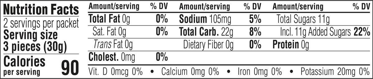 Tapioca Syrup*, Cane Sugar*, Maltodextrin*, Acidity Regulator (Citric Acid), Gelling Agent (Pectin), Sodium Citrate, Natural Flavour, Potassium Citrate, Green Tea Extract (Contains Caffeine), Colour (Carrot Juice*), Glazing Agent (Sunflower Oil*, Carnauba Wax*). *Organic ingredient