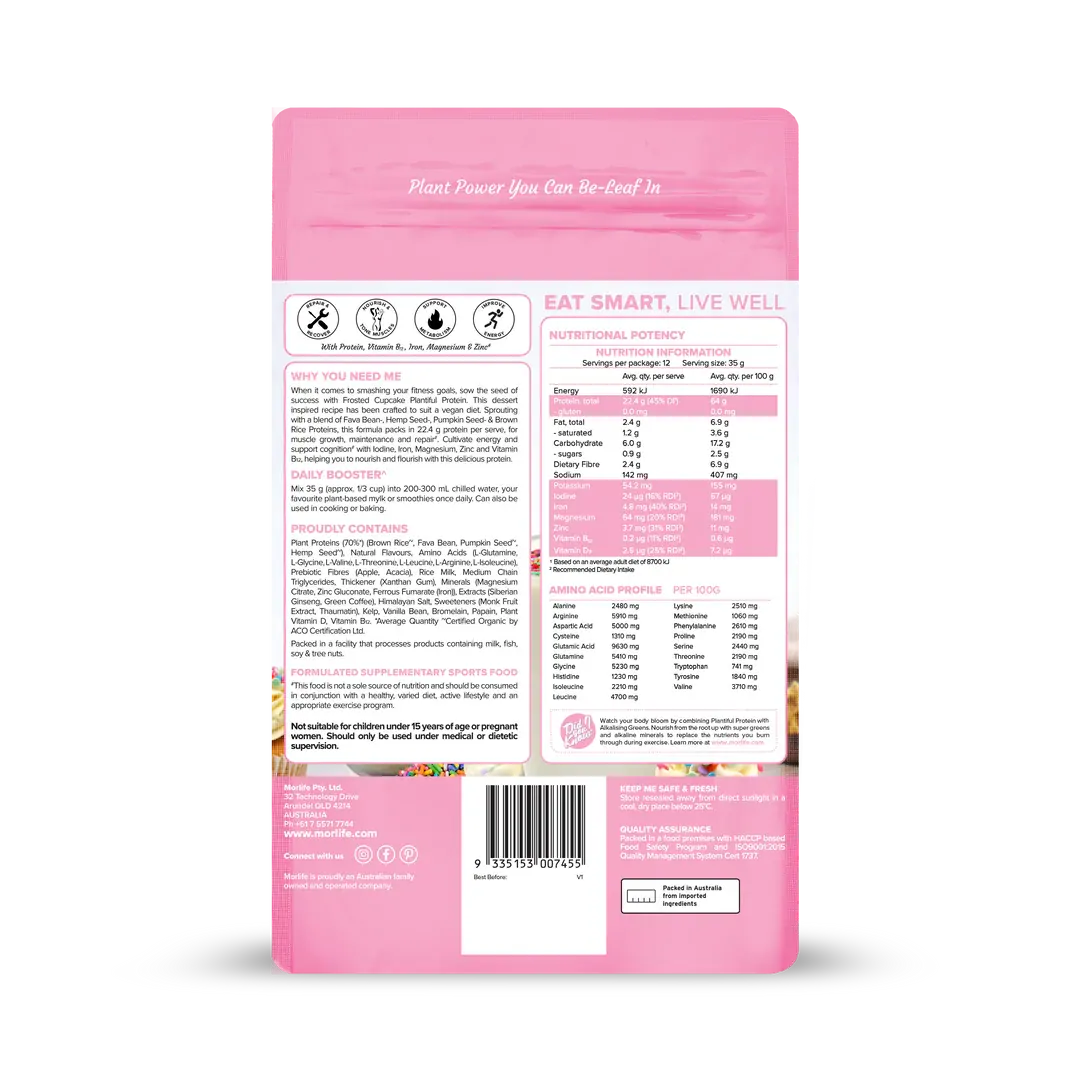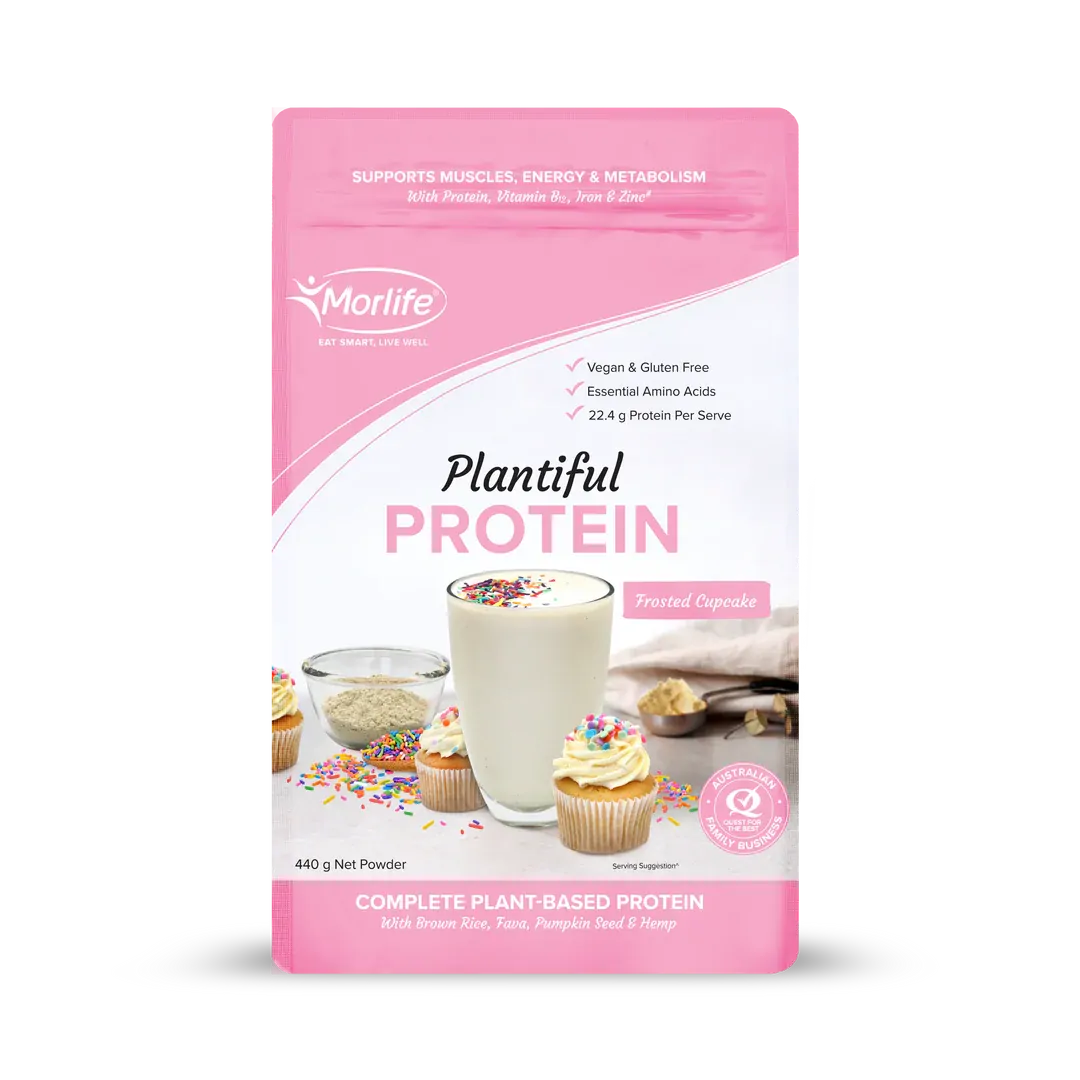 Support recovery, energy, and focus all in one. More than just a plant-based protein, Frosted Cupcake Plantiful Protein delivers 22.4 g of complete protein plus essential nutrients like Iron, Magnesium, Zinc and B12 to help you repair muscles, boost metabolism and stay sharp. Perfect for vegans, fitness lovers and anyone wanting to feel fuller for longer. It is the ultimate blend to help you feel the difference and thrive.
