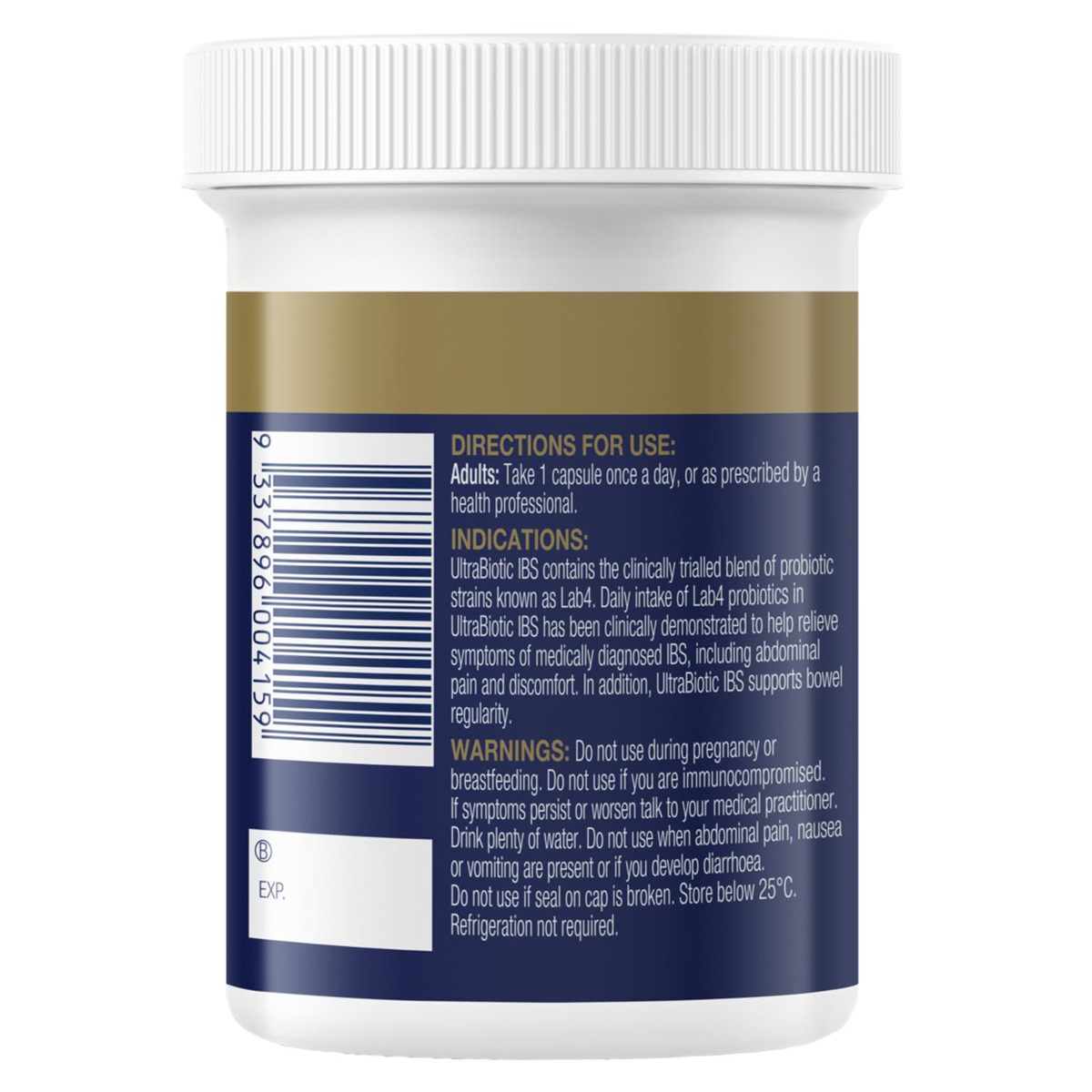 UltraBiotic IBS is an evidence-based formulation containing the Lab4 blend of probiotic strains, delivering 25 billion CFU per capsule. Daily supplementation with Lab4 probiotics, as found in UltraBiotic IBS, has been clinically shown to relieve symptoms associated with medically diagnosed IBS, including a reduction in abdominal pain and bloating with significant reductions from 4 weeks. It also supports bowel regularity and healthy mood balance. This product is vegetarian-friendly, with no added dairy.