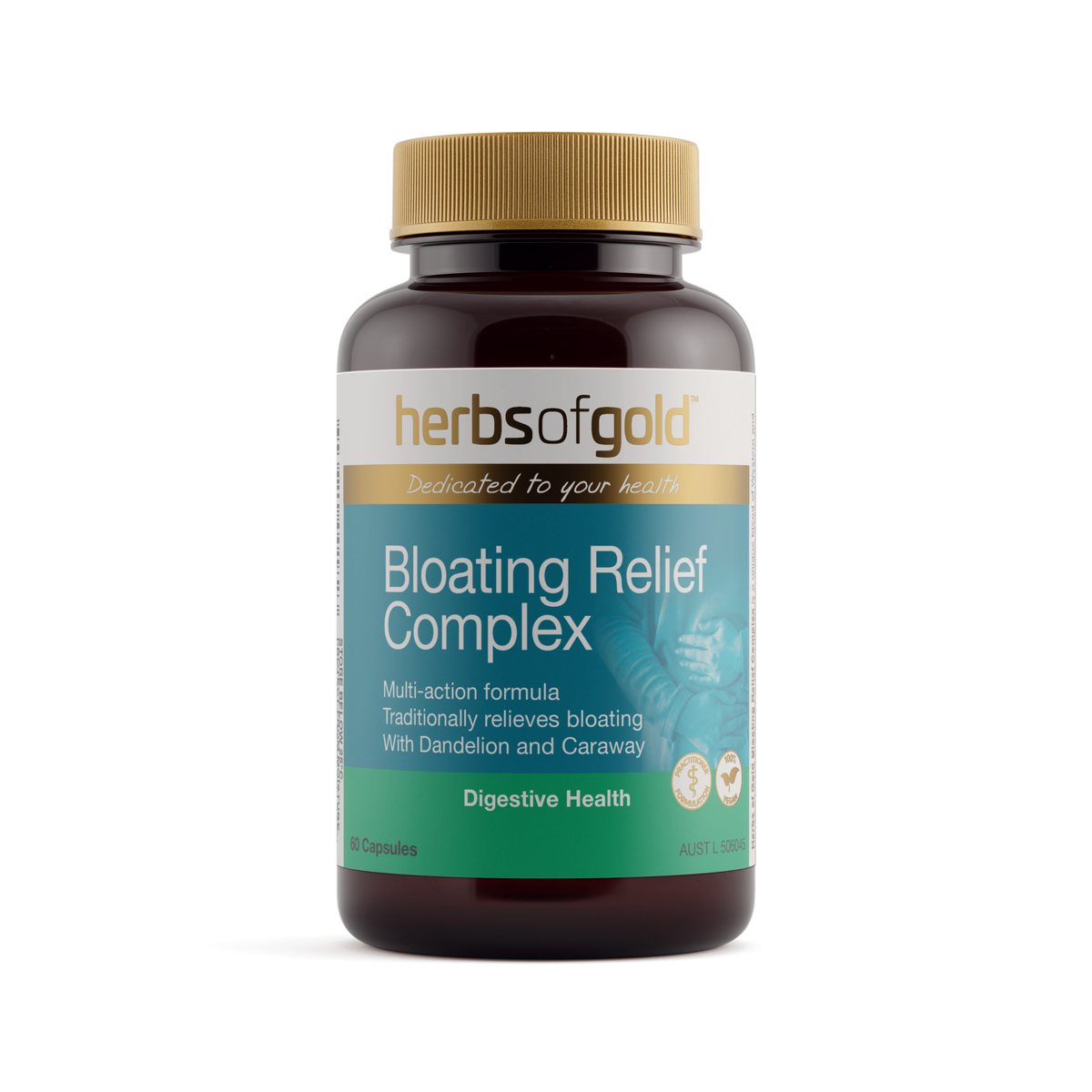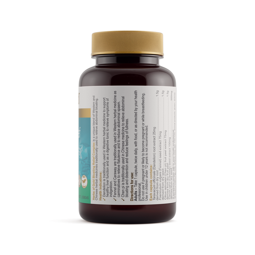 Herbs of Gold Bloating Relief Complex contains herbs traditionally used in Western herbal medicine and Chinese medicine to relieve abdominal bloating.