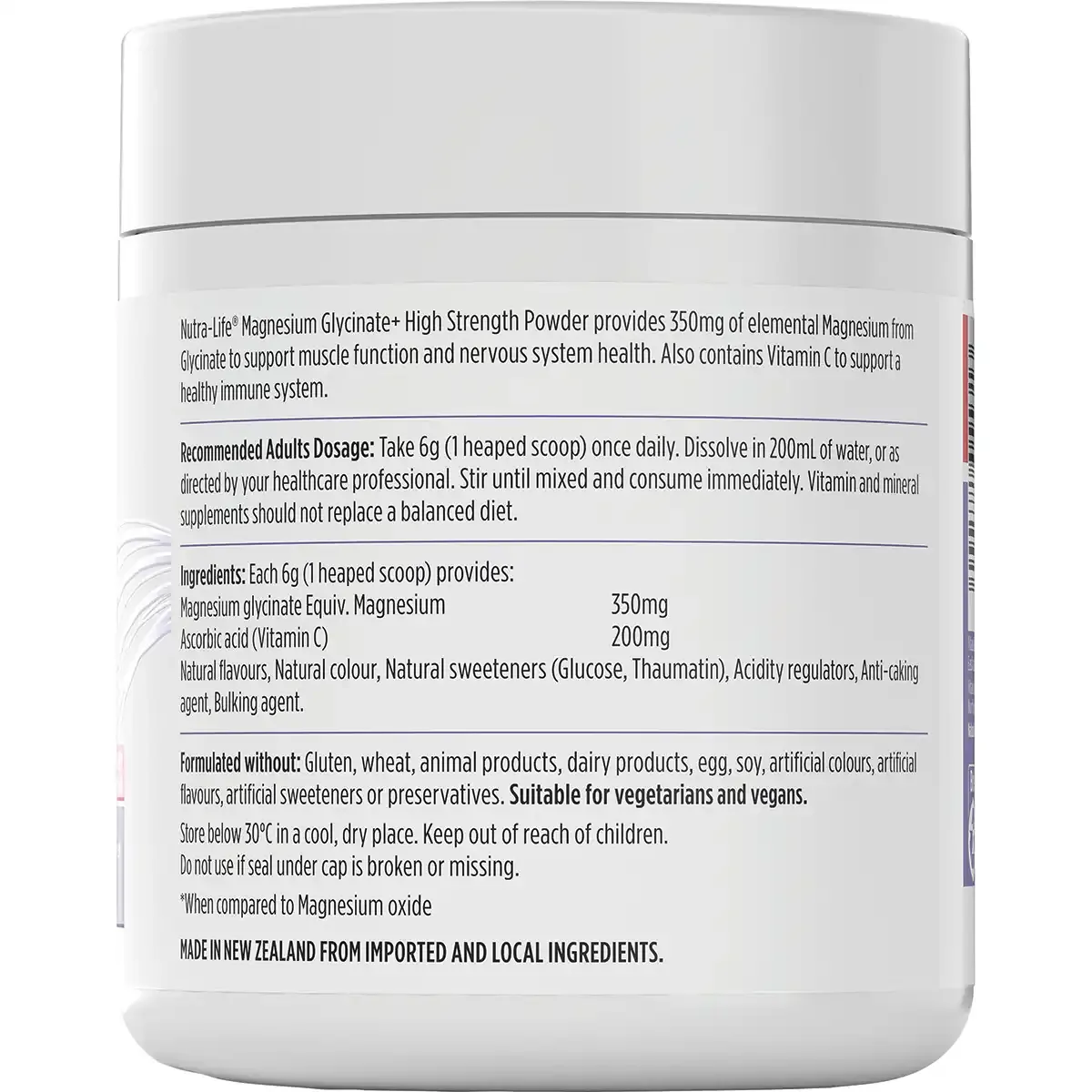 Nutra-Life® Magnesium Glycinate+ High Strength Powder provides a high strength 350mg dose of elemental Magneisum from Magnesium Glycinate to support muscle function and nervous system health. Also contains Vitamin C to support a healthy immune system.