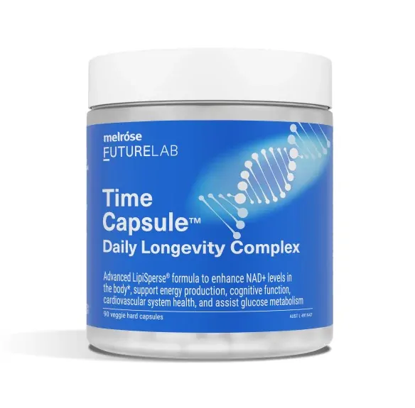 FutureLab Time Capsule Longevity Complex is a comprehensive, multi-targeted formula developed to restore cellular energy, optimise metabolic health, enhance resilience to stress, and support neurocognitive performance. It delivers 12 synergistic actives, including nicotinamide riboside, resveratrol, berberine, dimethylglycine, chromium picolinate, magnesium amino acid chelate, L-theanine, and activated B-vitamins, all enhanced with LipiSperse® and VeriSperse® delivery systems to overcome absorption barriers and all enhanced with LipiSperse® and VeriSperse® delivery systems to overcome absorption barriers and improve clinical impact.